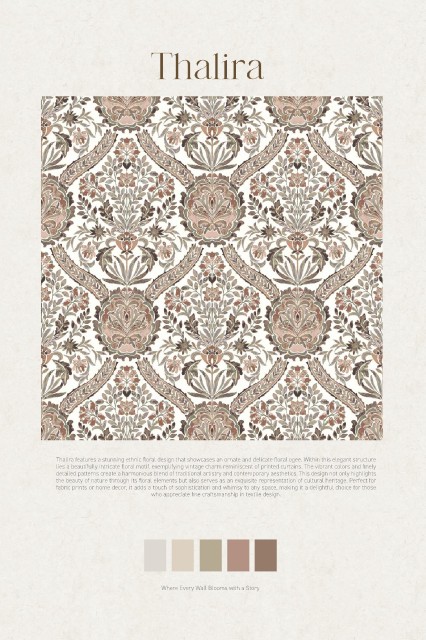Thalira features a stunning ethnic floral design that showcases an ornate and delicate floral ogee. Within this elegant structure