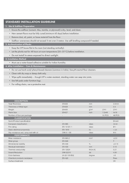 • Let the planks rest for 48 hours at room temperature (20–35°C) before installation.