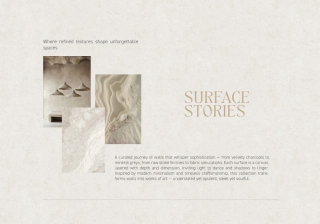 mineral greys, from raw stone finishes to fabric simulations. Each surface is a canvas,